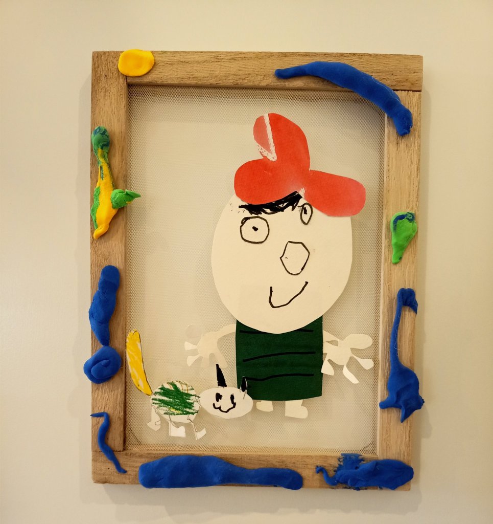 🐣 มีเด็กที่บรรยายตัวเองในภาพที่ตัวเองคอลลาจว่า “ใส่ชุดแบบลายๆ ใส่หัว หัวใส่หมวก เท้าเค้าเอาไว้เดิน มีแมวชื่อมานา จับหางด้วย”