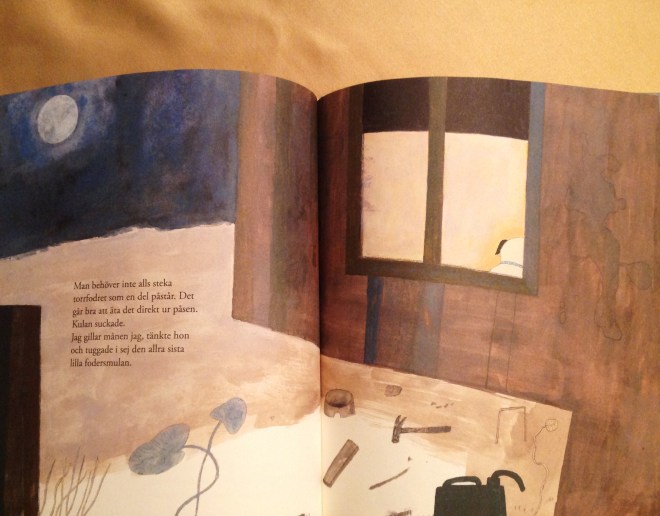 Three years ago, I wrote letters to Eva Lindström, the Swedish illustrator whom I have admired for a long time , with the help of The Embassy of Sweden in Bangkok. She was very kind and replied my letters with the big parcel! I opened it and found three beautiful picturebooks which were Min vän Lage, En fågeldag and Jag rymmer! She signed each book with these lovely drawings.