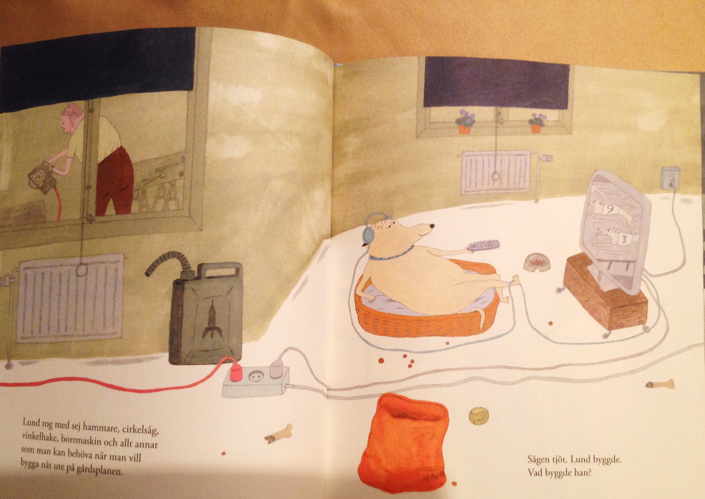 Lund กำลังทำอะไรกันแน่นะ แต่ Kulan สนใจซะที่ไหนกันล่ะ เธอนอนดูโทรทัศน์อยู่ในบ้านอย่างสบายอารมณ์ (ภาพนี้ชอบที่คุณ Eva วาดให้ Kulan เอาเท้าเขี่ยสายไฟ – เวลาที่เด็กหรือผู้ใหญ่รู้สึกสบายใจ มักจะแกว่งเท้าไปมา – จุดเล็กๆ ตรงนี้เองที่ทำให้รู้สึกว่าภาพนี้มีชีวิตชีวา) A regular space rocket I see, Kulan shouted. You got it, Lund said. Back soon, Lund call. ปรากฏว่า Lund สร้างจรวด สร้างเสร็จแล้วก็นั่งจรวดบินไปอวกาศซะอย่างนั้น ทิ้งให้ Kulan อยู่บ้านคนเดียว “ที่บอกว่าเดี๋ยวก็กลับมาน่ะ หมายความว่ายังไงของเขากันแน่” Kulan ที่ดูเหมือนไม่สนใจอะไรเริ่มรู้สึกเหงา Some say you need to fry the kibble, but you don’t really. You can eat it straight from the bag just fine. Kulan sighed. I do like the moon, she thought and finished the last crumb of dog food. จริงๆ แล้ว Kulan ไม่ได้อยากจะกินอาหารทอดหรอก อาหารหมาน่ะกินมันเปล่าๆ ทั้งอย่างนั้นเลยก็ได้ เธอแค่อยากให้ Lund สนใจเท่านั้นเอง แล้วตอนนี้เป็นยังไงล่ะ ต้องมานั่งกินอาหารอยู่คนเดียว ฉันชอบพระจันทร์จริงๆ นะ (แต่ฉันชอบให้มีเธออยู่ใกล้ๆ ฉันมากกว่า) ตอนนี้ Lund ไม่อยู่ให้เธอบอกแล้ว เขาว่าเดี๋ยวจะกลับมา เดี๋ยวจะกลับมาน่ะมันเมื่อไหร่กัน